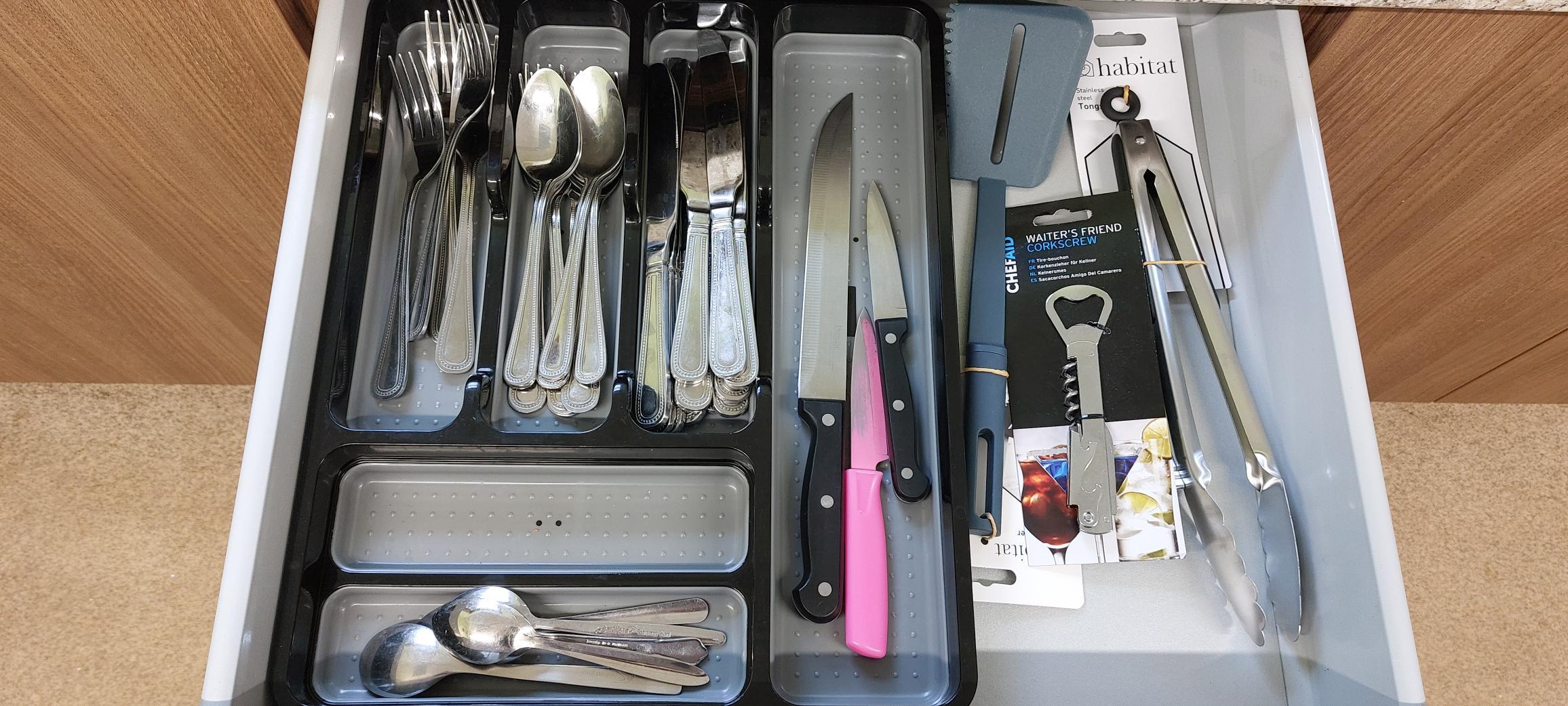 Cake knife/server, dishcloths, tea towels, hand towels for kitchen, cloths and detergent for cleaning kitchen surfaces, toilet cleaner.